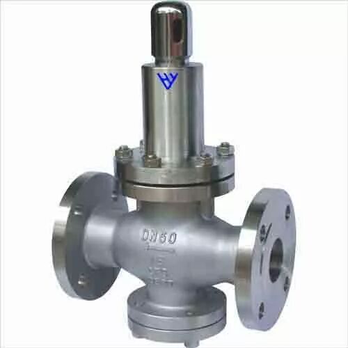 通过调节调节弹簧压力设定出口压力,利用膜片传感出口压力变化,通过导阀启闭驱动活塞调节主阀节流部位过流面积的大小,实现减压稳压功能。
